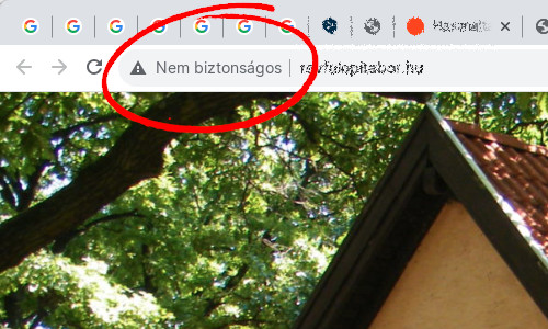 Nagyon nagy hiba, melyet minden böngésző azonnal kiszűr. Ez az elavult, nem frissített és karbantartott honlapoknál jelentkezik, súlyosabb esetben olyan programkódok (akár vírusok) is találhatók benne, melyek miatt a weboldal egyáltalán nem jelenik meg. Egyszerűbb esetben csupán az SSL protokoll nincs beállítva (mint az alábbi képen), ott egyszerűen meg kell tenni a megfelelő lépéseket a biztonságért. Ha a weboldal teljesen tiltva van, csak az újraépítés segít.